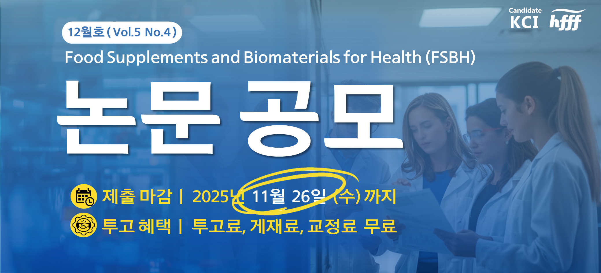 건강기능식품학술지 FSBH는 KCI 등재 후보지로 건강기능식품 및 생물학적 기능성 소재에 대한 새롭고 혁신적인 연구결과를 발간하고 있습니다. 12월호 논문 제출 마감일은 11월 26일 (수)까지이며, 투고 관련 자세한 사항은 FSBH 홈페이지에서 확인 가능합니다. (홈페이지 바로가기)