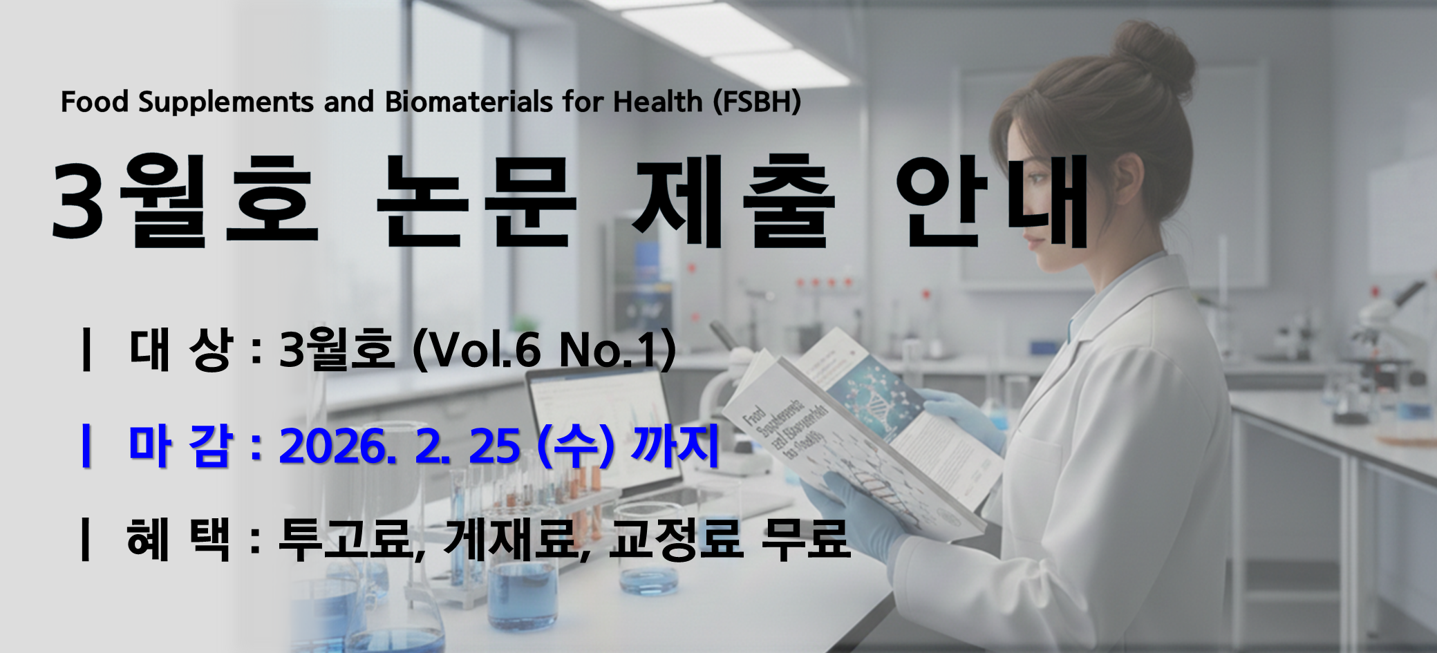 건강기능식품학술지 FSBH는 KCI 등재지로 건강기능식품 및 생물학적 기능성 소재에 대한 새롭고 혁신적인 연구결과를 발간하고 있습니다. 26년도 3월호 논문 제출 마감일은 2월 25일 (수)까지이며, 투고 관련 자세한 사항은 FSBH 홈페이지에서 확인 가능합니다. (홈페이지 바로가기)