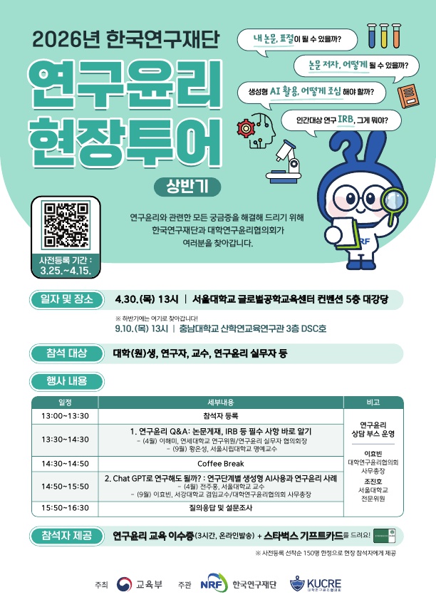 이와 관련하여, 연구윤리 이슈에 대한 교육 및 의견수렴을 위한 ‘2026년 연구윤리 현장 투어’를 아래와 같이 개최하오니, 많은 참여를 부탁드립니다.